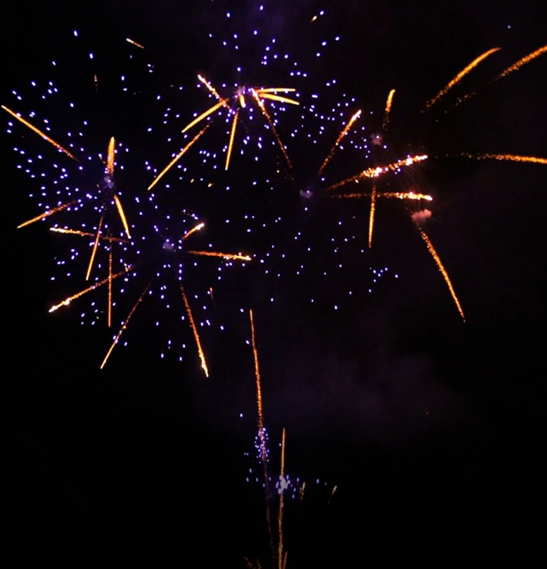 Z-Shape Cake Blue Mine to Gold Titanium Tail to Red Strobe Palm with Blue Stars combined with Blue Mine to Golden Wave Tail to Golden Wave Palm with Blue Stars