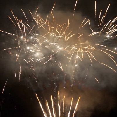 Gold Tail to Brocade Crown and Blue Stars, Green Strobe, Red Strobe, White Strobe, Golden Strobe, Purple Stars or Crackling, Fan shape with 7x7 shot